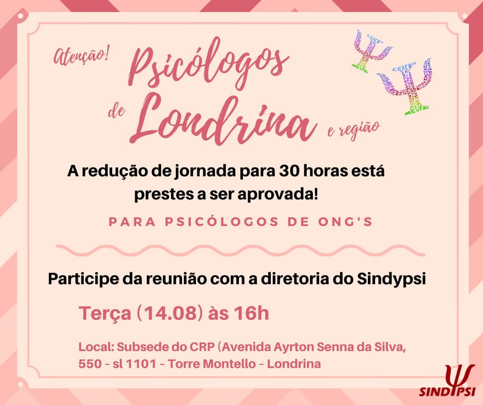 A diretoria do sindicato estará presente para negociação da redução de jornada de trabalho para 30 horas profissionais da psicologia que atuam em entidades culturais, recreativas, de assistência social e de orientação e formação profissional.