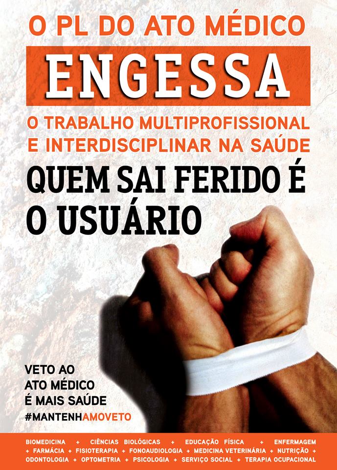 A campanha “O PL do Ato Médico engessa o trabalho multidisciplinar na saúde: quem sai ferido é o Usuário” é resultado da articulação de 14 categorias profissionais que reivindicam a manutenção dos vetos do Ato Médico.