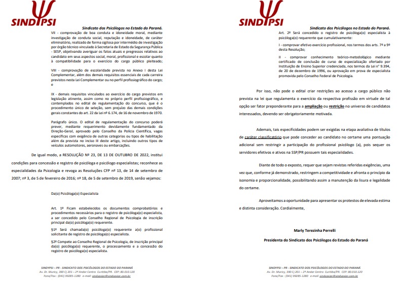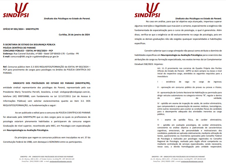 O Sindicato dos Psicólogos do Paraná protocolou ofício à Polícia Científica do Paraná para contestação ao Edital sob nº 002/2024-PCP, quanto à exigência de especialização para candidatos de formação em Psicologia. Ao que, a Comissão do Concurso, removeu tal requisito, ampliando a possibilidade de participação de