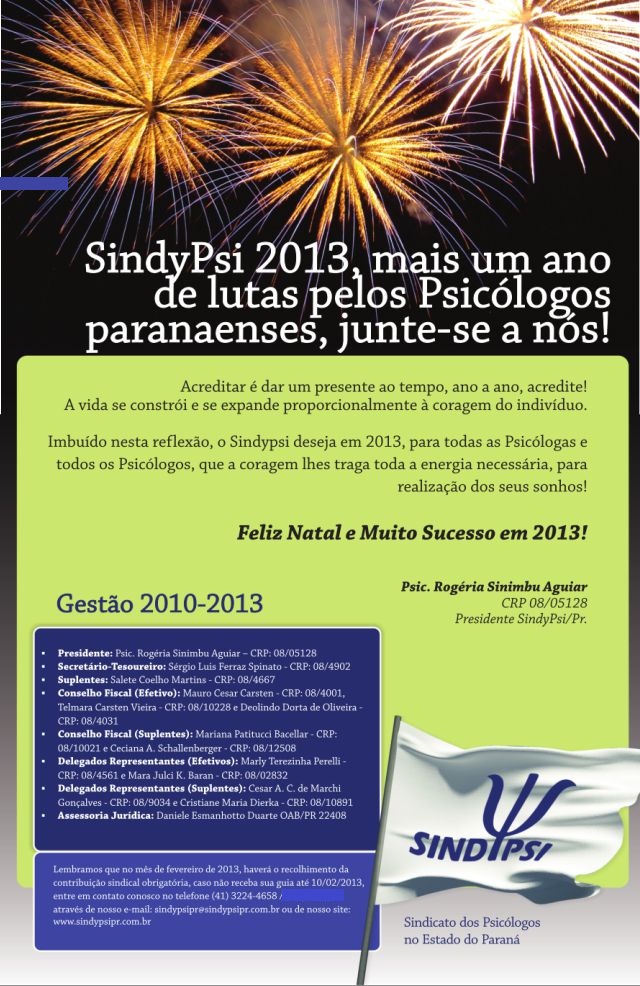 Feliz Natal e Muito Sucesso em 2013 21/12/2012 0 715 Confira mensagem do Sindypsi-PR a todos os psicólogos do Paraná!