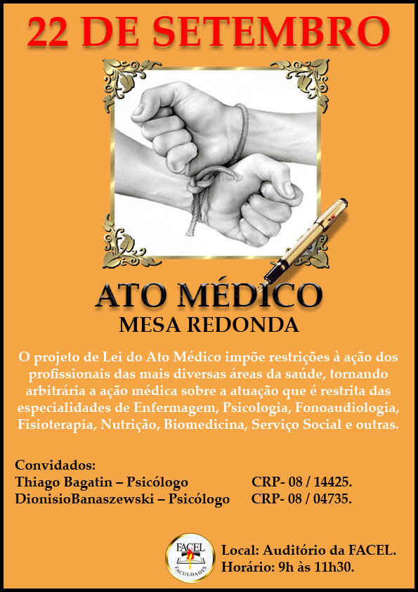 O projeto de Lei do Ato Médico impõe restrições à ação dos profissionais das mais diversas áreas da saúde. O evento é gratuito e aberto ao público, iniciando às 9h da manhã no auditório da faculdade FACEL.