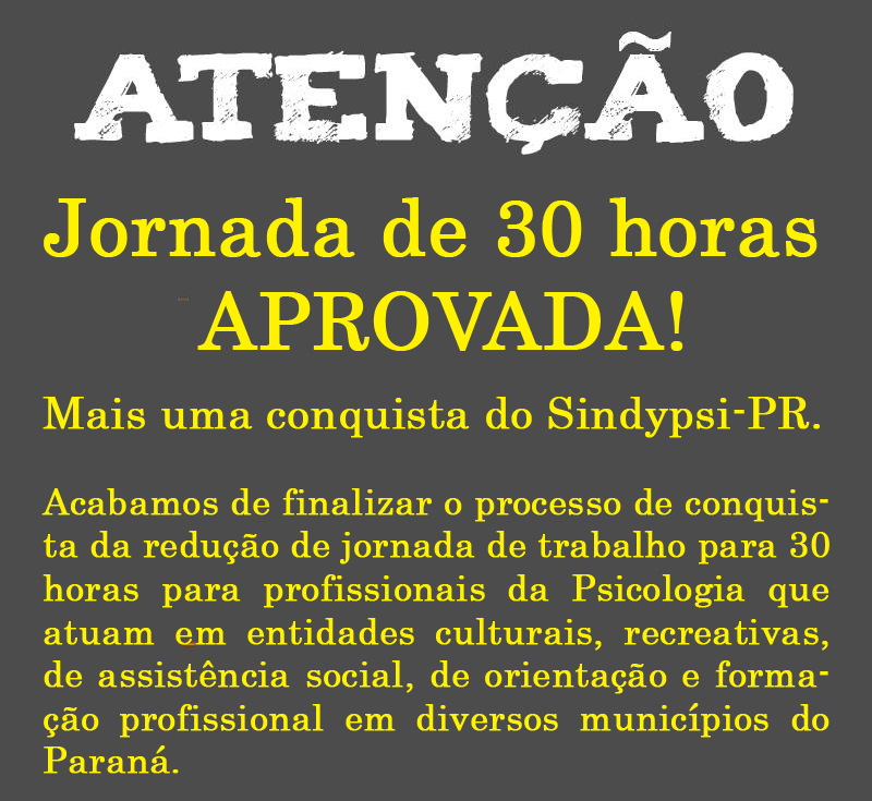 Mais uma conquista do Sindypsi. Acabamos de finalizar o processo de conquista da redução de jornada de trabalho para 30 horas profissionais da psicologia que atuam em entidades culturais, recreativas, de assistência social, de orientação e formação profissional em diversos municípios do Paraná. Se você atua em alguma dessas áreas, entre em contato com o Sindypsi e saiba como requerer a redução de jornada.