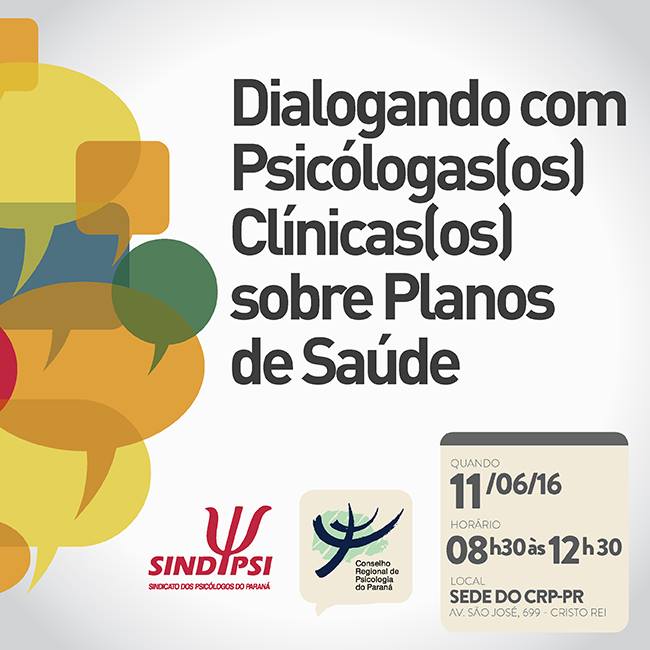No sábado (11), o Grupo de Trabalho de Clínica do Sindicato dos Psicólogos do Paraná e a Comissão de Psicologia Clínica do Conselho Regional de Psicologia do Paraná vão realizar um encontro com psicólogas/os clínicas/os para debater condições de trabalho nos planos de saúde. O Dialogando com psicólogas/os clínicas/s sobre planos de saúde surgiu após as entidades receberem reclamações de psicólogas/os insatisfeitas/os com a falta de autonomia no trabalho (número de sessões anuais, tempo de consulta etc) e com o baixo valor pago a cada atendimento.