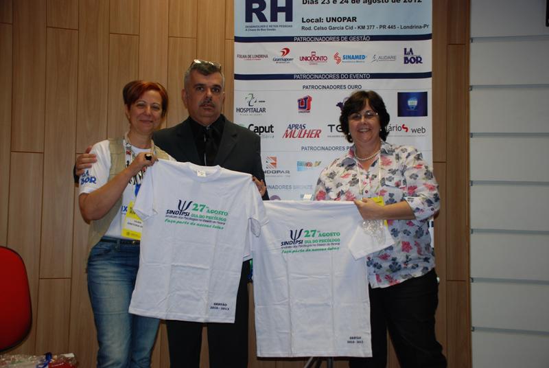 O Sindypsi PR esteve presente, representado pelo seu diretor-secretário, psicólogo Sérgio Spinato. Na foto Sérgio está entregando as camisetas comemorativas do Dia do Psicólogo para a Presidente da ABRH Norte Administradora Vilma Munhê e para a Vice-Presidente Psicóloga Adilseia Soriani Batista